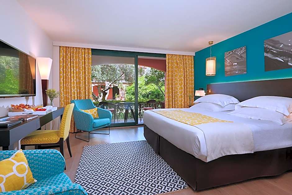 An elegant air-conditioned room with a private balcony that opens up to views of the swimming pool. Bathrooms are attached and include free toiletries.